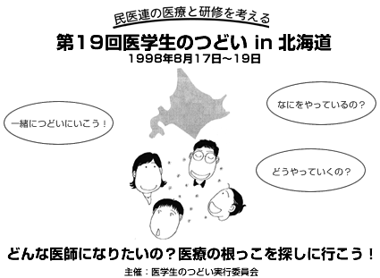 あなたは「医学生のつどい」って聞いたことがありますか?つどいとは、全国の医学生が毎年夏に集まって、今の医療のこと、病院の中からだけじゃな く、地域の中でみた患者さんのこと、勉強のこと、自分の将来のことなど、色々なことについて一緒に考え、学び、自分の言葉で語り合う場です。 普段大学の 中だけでは、なかなか話せないこと、学べないことを、つどいでは思う存分出し合うことができるので、毎年とても充実し、楽しい集まりになっていま す。…「今年はどこでやるの?」「北海道!!」「わくわく」