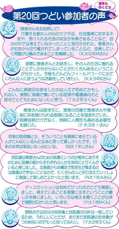 各企画ごとに行ったスモールグループでのディスカッションや夜の交流会では医師や看護婦さん、共同組織の方に入ってもらい、真剣に議論しました。もちろん楽しーい交流会もしたよっ。帰りにはアドレス交換をして別れをおしみました。