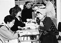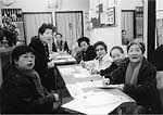 毎月集まる仲良し班会ほおずき班が、「大腸がんチェック」をテーマに健康班会を開きました。集まった九人は、身長・体重・血圧測定・体脂肪測定・塩分チェック・骨密度とワイワイ、学校健診を思わせるにぎやかさ。笑いの絶えない班会です。 (坂本佐和子) |