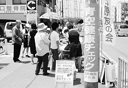 | 七月一七日、スーパー「トリオト」前で世話人六人と職員七人で午前一一時から一時間、青空健康チェックをしました。店長さんも「どうぞどうぞやってください」と協力的。五分もすると人がならびはじめ、横山看護師長は一時間休むひまなく血圧測定を続けました。 五〇人をこえる人の血圧、体脂肪の測定を行ない、同時に老人保健の「高額医療費の登録はおすみですか!」と呼びかけたり、前進座の公演「銃口」のビラも 配布しました。 (今村和雄) |