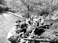 八月二日、仙台市の奥座敷・秋保温泉近くの二口渓谷で流しソーメン会をしました。会員の実家で太い青竹を切り出し、現地で二つ割にして、冷たい湧水を通してソーメンを流します。冷水で締まったソーメンの味は格別、のどごしがよく、持 ち寄った料理や漬物とともに幾らでもお腹に入ります。湧き水を汲みに来た人にもソーメンをふるまいました。 (柴田勲) |