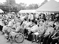今年は「笑いは健康の源」として秋田AスケBスケ氏による漫才も。友の会舞踊サークルを先頭に参加者がつぎつぎと踊りの輪に加わった「民謡盆踊り」は壮 観でした。過去最高の千人の参加で大成功。