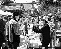 三月一五日、左京区の知恩寺で年金改悪反対の署名をみなさんにお願いしました。手づくり市でにぎわうお寺の境内の一角をお借りし、会員手織りのマフラーやスカーフ、コーヒーやジュースなどを販売しながら、「イラク派兵NO」のバッ ジ、ピースウォークのバンダナも並べてよびかけました。 お天気もよく、たくさんの人出があり、署名も百筆集まりました。 (大石紀代子通信員) |