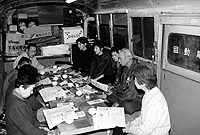 今回は大人数の一七人が参加。健康チェックが終わったあとは、年金について学習。「フザケルナ二〇〇四年年金大改悪」のビデオをみんなで見ました。 これから年金をもらう世代ということもあり、真剣なまなざし。年金改悪反対署名もあっという間に埋まりました。 (前川貴嗣) |