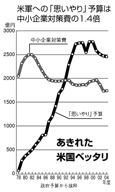 | 「思いやり」予算とは、日本が負担 する義務のない在日米軍の駐留経費を支出するために、78年、当時の金丸信防衛庁長官が「思いやりの精神で」と始めたもの。米軍の家族住宅や体育館・野球 場建設、水光熱費、訓練費、新施設のための場所探しの費用までふくまれ、04年度予算では、2441億円に。中小企業対策費の1・4倍です。 |