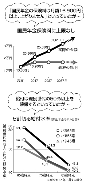 衆議院では民主党を抱き込んで通過させましたが、参院にきて様相はがらっと変わっていました。本会議(5月12日)や厚労委員会での私の追及で、自民・ 公明がいってきた「保険料は上限をもうけて固定」「給付は現役世代の手取りの50%以上」という2枚看板がウソだったことがわかり(左表)、国民の怒りが ますます大きくなったからです。