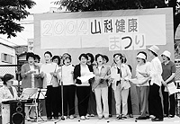 五月三〇日、山科健康まつりを行ないました。山科では友の会が中心となって行なうまつりははじめて。健康まつりをしようと呼びかけたものの「実行委員会形 式ってどういうふうにしたらいいの?」。最初どうなることかと思いましたが、のべ八五〇人参加で大成功をおさめました。 当日のステージは人形劇・健康体 操・うたごえにマジックショーと多彩なものに。骨密度測定をはじめとする健康相談も大人気で要員は食事をとるひまもないほどでした。「つぎは参加者のくつ ろげる日陰をつくらなあかんな」とみんな日焼けした真っ黒な顔をみあわせていました。