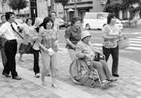 在宅福祉総合センターきずなは開所五周年 をむかえ、七月一日から三日間、感謝をこめて、デイサービスの利用者に花束を渡しました。利用者の山城静枝さんは、「職員のみなさんはとても親切。毎週き ずなへ来るのが楽しみです」と。開所当時、デイサービスの利用者は一日に五~六人。たった一人の日もありましたが、介護保険制度の導入とともに増えつづ け、今では一日に五〇人をこえます。