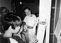 | 六月末に第二四回すみだ住宅デーが区内一五カ所で開かれました。友の会では、すみだ共立診療所と鐘ヶ淵訪問看護ステーション、すみれ訪問看護ステーションの協力を得て、「健康相談コーナー」として初めて参加しました。 三人の看護師さんに事業所に近い会場を担当してもらいました。はじめてのとりくみなので呼び込みも必要と、役員も大張り切りで「無料血圧測定と体脂肪測 定をやってますよ!」と宣伝。包丁やまな板削りに来たお母さんたちが列を作るほどの盛況となりました。 参加した役員からは「来年はもっと多くの会場でやりたいね」と成功を喜ぶ声が聞かれました。 (柏葉長一) |