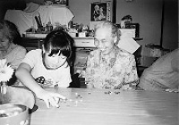 二日目は朝早くに憲法の読みあわせをしました。そのあとデイサービス利用者と一緒に遊びました。昔の遊びを習おうと、おはじきやお手玉をし、「はい、今度はおじょうちゃんの番ね」「うん」とお互いすぐにうちとけ楽しいひとときでした。