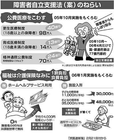 急浮上してきた障害者自立支援法案も大きな怒りをよんでいます。障害者の声も聞かず、いきなり大変な負担増を押しつける(左図)。そもそも、「応益負担」というけれども、障害者がサービスを受けるのは「益」なのでしょうか。