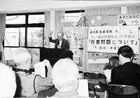 やましろ医療生協では社保学校で「改悪問題について」と題して憲法改悪阻止の学習会を開きました。講師の中尾弁護士は、現行憲法成立のいきさつから、天皇の位置づけの矛盾、そして九条の持つ意味の世界的な価値を中心として話されました。憲法について、わかってるようで、空気のような存在になっている。「私たちはいま、憲法を一から学ばなければならない」と強調されました。 (加藤節子通信員) |