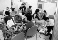会場ではさっそく健康チェック。血圧や体脂肪・骨密度が気がかりな会員も多く、説明を受けて、安心したり心配したり。南総師長の健康講話は、太っている となぜ悪いか、どんな食事がよいか、どんな運動がよいかなど、具体的でわかりやすく、みなさん納得。