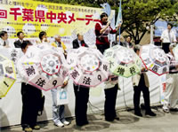 五月一日、千葉中央公園で千葉県メーデーがおこなわれ、二〇〇〇人が参加しました。プロ級イラストレーターの腕を持つNさんに文字を作ってもらい、みんな で傘にペタペタと張り付けました。訴えは、「憲法」と「医療改悪」「看護師募集」の三本。一四本の傘でアピールし、毎年あるプラカードコンテストでは、見 事努力賞! “エネルギーをもらったね、また頑張ろう”とデモ行進しました。