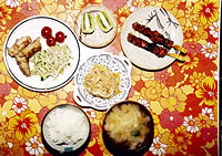 班会での楽しみは、会員さんが持ち寄っての試食会。この日は班長自らが山奥まで行ってとってきたサワガニのから揚げや会員さん手作りの特製まんじゅう、 肥後の完熟メロンと、グルメ気分は最高潮!