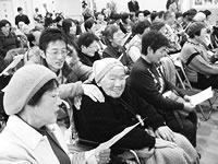 | 全国に出かけ、一人芝居「岸壁の母」で戦争反対を訴えている、組合員の野津清則さんを迎え、一月二三日、八束町・肝っ玉班会をしました。お芝居を見て、 戦争体験を語り合いました。七〇代半ばの野津さん。老母の扮装をして、戦死の知らせがあっても、舞鶴港まで繰り返し出迎えに行く、母の切ない心を演じ切り ました。 一年数カ月振りに参加した私を班の皆さんが喜んでくれ、芝居が出雲弁なので他県から移り住む私が言葉がわかるのかと心配してくれたり…。うれしいことです。 (加茂京子通信員) |