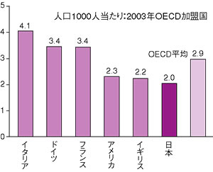 일본의 의사는 어느 정도 부족한가. OECD(경제협력개발기구) 가맹국의 인구 10만명 당 의사수 평균은 약 290명. 일본은 200명 정도로, 가맹국 29개 국가 중 26위입니다.