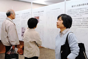 본 회장에서만은 협소하기 때문에 실행위원회 독자기획으로서 별도의 회장에서도 전시가 거행되었습니다. 731부대의 역사와 잔학행위의 실태, 의사, 의학자의 협력, 아메리카에 의한 면책 경위, 전 731부대원의 <왜 내가 비난받아야 하는가> 하는 변명, 전후의 의학교육의 실태 등이 전시장을 꽉 메웁니다. 전시를 뚫어지게 응시하며, 열심히 서로 논의하는 의사들의 모습이 있었습니다.