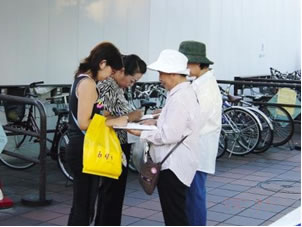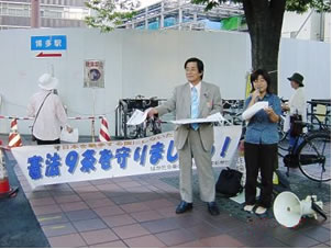 8/27夕方、博多区革新懇とはかた9条の会は恒例の9条署名宣伝を博多駅前にて行いました。さしもの陽射しも傾き、 ビル街を時折、涼風が通り抜けます。参議院選挙で改憲を唱え、大敗した安倍内閣が新たに組閣したとのニュースがながれるなか、この有利な情勢を活かし、靖 国派を孤立させ、9条改憲の企てを阻止しようと通行人に呼びかけました。