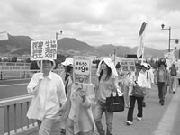 三〇度を超える暑さの中、午前中は元気よかった参加者も、昼食後はさすがに足取りが重くなりました。しかし、車のクラクションでの激励や、農作業の手を 休め「がんばって」と声をかけてくださる人など、大勢の応援を力に、何とか無事に歩き通すことができました。