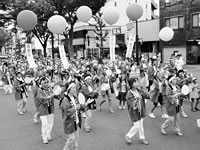八月四日、「紀州おどり ぶんだら節」に今年も参加しました。「ぶんだら節」は、ミカンを買い集め、悪天候の中、江戸まで運んだことで知られる江戸中期の 豪商・紀伊国屋文左衛門の心意気と壮挙をイメージして名付けられたといい、船出の高揚感を連想させる民謡にあわせ踊ります。各種団体や企業などでつくる踊 りのグループが六七参加。約七六四〇人がそれぞれ揃えた法被などに身を包み、和歌山城前の大通りを踊り歩きました。三九回目の今年は、約一二万五〇〇〇人 の人出に。私たちは「健康をつくる 平和をつくる」のビッグ風船でアピールしながら、医療生協組合員と職員一三〇人で、元気に踊りました。