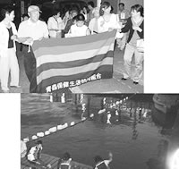 茶屋町地蔵様の宵宮・堤川への灯籠流しは街のみんなの大切な行事です。各家庭ではお客様の接待で大忙し。支部では「平和憲法を守ろう」「九条を守ろう」と平和への思いを書いた灯籠を五四個つくり販売。町内を流れる堤川の川岸まで平和行進、灯籠流しをしました。