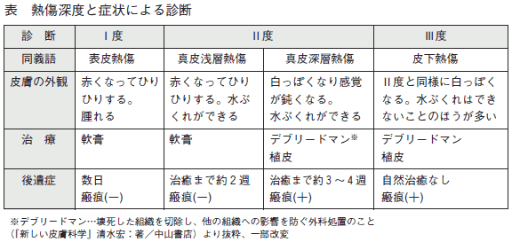 熱傷は傷の深さによって、I~III度に分けられ、「低温やけど」では、最も重症なIII度の熱傷が多く見られます(表)。