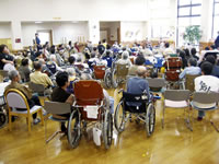 トリは「和太鼓・いく座」の力強い太鼓。響きがお年よりのエネルギーを引き出しました。「百点満点」「忙しいのにどこで練習したの、感心」「しっかりし ているネー」「唱歌・ふるさとをみんなで歌えてうれしかった」などの感想が。