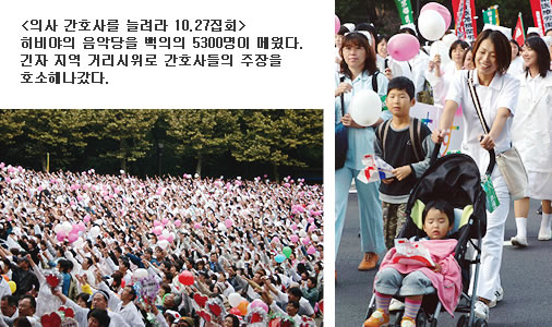 <의사 간호사를 늘려라 10.27집회> 히비야의 음악당을 백의의 5300명이 메웠다. 긴자 지역 거리시위로 간호사들의 주장을 호소해나갔다.