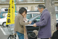 一月一四日の成人の日に、コープ東川原店入り口で、林財団の職員・友の会会員が個人で参加している「宇野学区九条の会」の賛同署名・宣伝行動に参加しまし た。午前一一時から一二時までの一時間の活動でしたが、学区の呼びかけ人の方含め総勢一二人が参加し、のぼり旗も立て、「宇野学区九条の会アピール」を手 渡しながら賛同署名の訴えをおこないました。