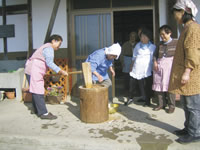 今年初めての日にお餅つきをしました。「暮れについた時は硬かった、今度はやわらかくつくか」と、重い杵を振り上げ、手がえしも息が合い、つきあがりま した。ついているよしのさんは、ことし83歳、1日何千もの食器を午前2時まで洗い、5時に起床して働いたという元女将さん「今は何もしてないの、だから エプロンもなくて」と、借りたピンクのエプロンが似合っています。