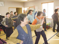 「歌いながら体を動かしてすっきりした」と好評。今できあがっているのは「北国の春」「三六五歩のマーチ」「きよしのズンドコ節」。それぞれ「座ったま まの体操」「足踏み」「全身の体操」と、高齢でも楽しめるよう工夫されています。