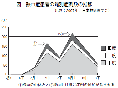毎年夏になると、熱中症が話題になります。「熱中症で倒れる人が相次ぎ、埼玉など6都府県で11人が死亡。気温が高かった東京、埼玉、群馬、岐阜の各都県と名古屋市だけで約350人が病院に搬送された」。これは、2007年8月17日、朝日新聞朝刊の記事です。