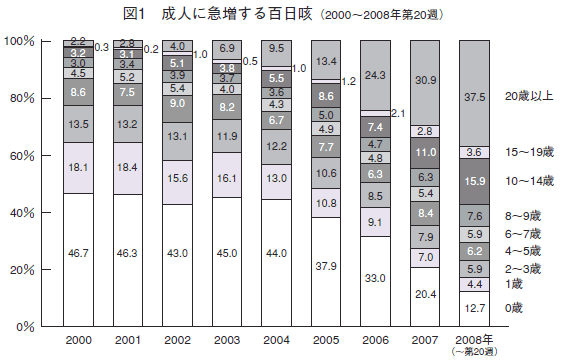 国立感染症研究所による最近の統計では、2008年1~5月に全国で2177件の報告があ り、そのうち20歳以上の患者が約40%を占めていました。このように成人の患者が急に増えてきています(図1)。いくつかの施設の報告では、長引く咳 (2~4週間ほど)のある成人患者の20~25%に百日咳の疑いがあるといわれています。