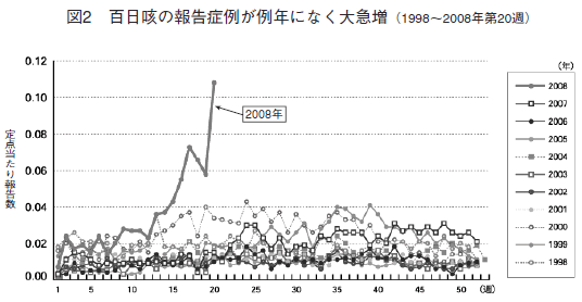 全国の感染症の報告を見ると、2008年は今まで以上に早いペースで患者が増え、5月はことに大幅に増えました(図2)。早急な対策が望まれます。