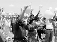「田毎の月」で全国に知られる姨捨山には「昔、六〇歳になったらお年寄りをこの山に捨てるよう命じた殿様が、お年寄りから授かった知恵で、国難を逃れた ことから、お年寄りの大切さに気づき、お年寄りを捨てることをやめた」という伝説があります。そこから「怒りの姨捨山一揆」と銘打ったこの集会には、多く の取材が入りました。