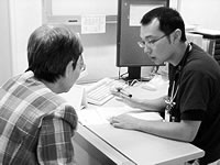 何度も論議をし、ふれあいクリニック検診室の協力も得て、被爆者健診の実現となりました。当日は三〇人が健診を受けました。一年目研修医も参加し、医師 九人、医学生二人ふくむ五七人の職員がボランティアに。初のとりくみだったため、健診にみえた方一人ひとりに職員がつき、案内をかねながら、被爆の状況な どを聞きとりました。