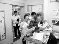 「保険証を忘れたんですけど…」「いりませんよ。どうぞどうぞ」。六月一六日、地域の集会所での健康チェック。初めての方を含め二時間で何と六〇人が受けました。支部恒例・市内巡回ボランティアです。