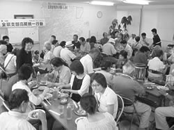 八〇歳以上の高齢者ばかりの「高原班」が誕生したのは一年前。院所から離れた生協不毛の地に拠点を作ろうと組織部が目をつけたのが発端でした。ここも例 に漏れず駅前商店街が寂れた地域です。小間物屋だった店舗に集まった高齢者の笑い声に誘われた職員が全員に加入してもらい、班を作りました。世間話に花を 咲かせていただけの人たちが、いまでは近くの宅老所のボランティアや、平和行進の炊き出しに協力しています。