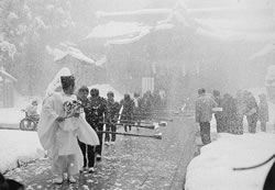 雪で三班に分けての参詣となり、集合写真が撮れません。しかし左義長の日と重なっていたため、各家庭から持ち込んだ正月用品などを積み上げ、地元の中学 生一二人が忌火をたいまつに移し、点火するようすを見ることができました。「こんな場面なかなか見られない」と大喜び。寒かったが幸福一杯の参拝でした。