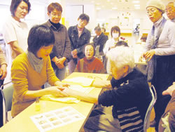 地域から二二人、病院の職員一〇人の参加で、それぞれの手を握りながらの実践。優しくマッサージをしながら、お互いの会話もはずみ、いつもの健康講座と は趣向の違ったものとなりました。受講後、さっそく、特養ホーム入居中のお友だちのお母様の手を握り実践した方も。