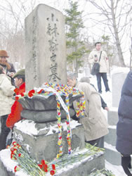 二月二〇日は多喜二が築地警察署による拷問で虐殺された日、小樽の「多喜二祭」へ。約一八〇人が集まった雪深い墓前は、一気に熱い想い一色に。