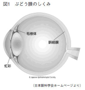 そもそもぶどう膜は、眼のどの部分でしょう。ぶどう膜とは、(1)瞳孔をつくる虹彩(カメラでいう“しぼり”)、(2)水晶体を調節しピントあわせをする 毛様体、(3)血管が豊富で栄養を運ぶ役目をする脈絡膜の、三つの膜から成り立っています(図1)。メラニン色素が豊富で、ぶどうの色に似ていることから この名がついています。これらの膜におきる炎症がぶどう膜炎です。