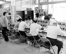 日帰り温泉には、支部運営委員で町役場職員の援助も得て話をもちかけました。施設側も快く協力してくれ、実施の運びに。当日、机やイスの設置や会場案内 張り出しまで施設側が準備してくれたので驚きました。日曜の午後で入館者も多く、五〇人を超える人が来て、好評でした。