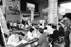 4月7日、京橋駅のコンコースで健康チェックをおこないました。用意した風船を両手いっぱいにもち、通行人に「健康チェックしてますよ!」と声をかける組合員さん。風船を膨らますのは男性部隊(時々破裂音で周りを驚かす場面も)。
