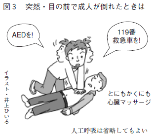 ここで救急隊到着までじっと待つだけではいけません。ただちに「心臓マッサージ」(胸骨圧迫)を開始します(図3)。