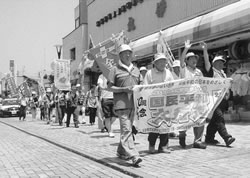六月一五日、国民平和大行進が加美町中新田を通過、幹事会で参加を確認し、九人の友の会役員・会員さんが、若い仲間とともに一時間、日本三大演習場の一つである王城寺原演習場の入り口までデモ行進しました。