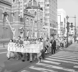 六月二七日、第四五回総代会を開きました。終了後、参加総代二六〇人余人で市内目抜き通りをアピール行進しました。医療・福祉・介護の充実を訴えての行進 は圧巻でした。デモは初めての人もいましたが、スローガンをはったうちわを掲げ、シュプレヒコールも交えたにぎやかなパレードに、市民からは手を振っての 応援も目立ちました。暑い日差しの中で、みんな元気いっぱいの行進でした。