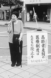宣伝を始めると、私にもしゃべらせてと女性がやってきました。マイクを握るとしっかりした口調で「私は大正10年生まれの88歳です。戦後もしっかり働 いてきた私たちを差別する後期高齢者医療制度は絶対に許せません」と。