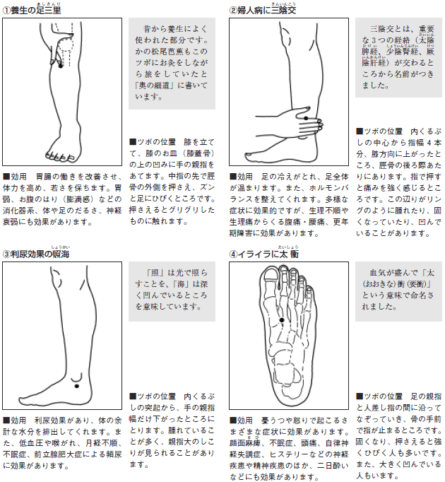 それでは、重要なツボの位置、効用などをあげておきましょう(上項)。今回は、自分でチェックしやすい膝から下、足の先までを紹介します。